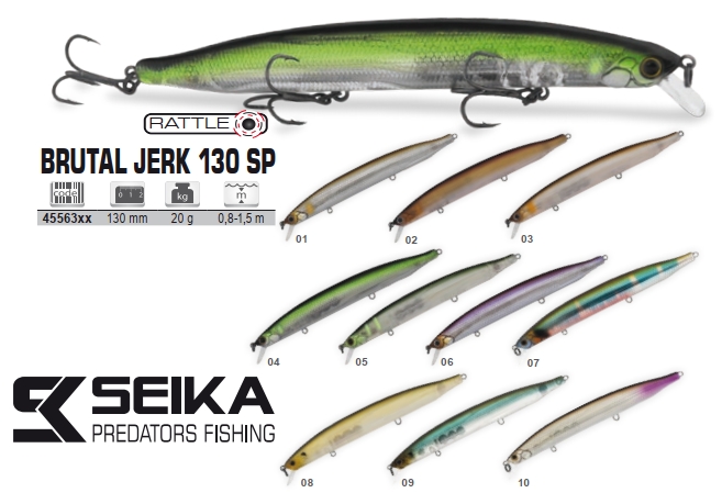 Džerkbejt od 130 mm, 20 g, sa suspenzionom akcijom, idealan za ribolov predatora kao što su crni bas i štuka. Unutrašnje pokretne težine za odličnu sposobnost zabacivanja i savršeno podešavanje ribolova. Pažljivo odabrane boje i maksimalna pažnja posvećena detaljima. Odličan je u trenucima jake apatije kod ribe, sa dugim trzajima i prilično dugim zaustavljanjima. Ima prsten od nerđajućeg čelika i crne niklovane trostruke udice za maksimalno prodiranje i otpornost na koroziju.
